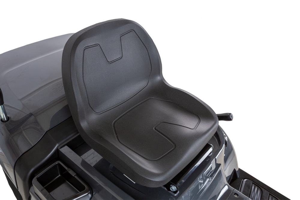 Ergonomisch angeordnete Bedienelemente, ein bequemer Sitz sowie die LED-Scheinwerfer für Arbeiten in der Dämmerung erhöhen den Bedienkomfort deutlich. Der Fangkorb mit Füllstandanzeige sorgt für sauberes Arbeiten und zeigt rechtzeitig an, wann eine Entleerung notwendig ist.