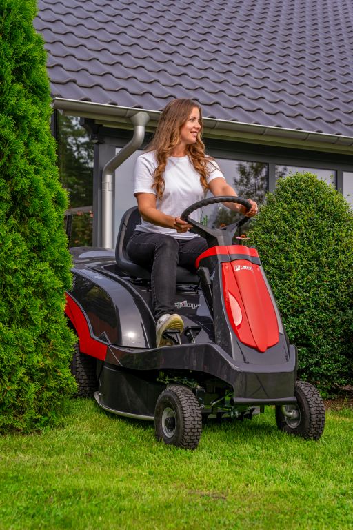 Kompakter Aufsitzmäher mit 72 cm Schnittbreite, Hydrostat und 180 l Fangkorb – wendig dank kleinem Wendekreis, komfortabel mit Easy-Lift Schnitthöhenverstellung und elektromagnetischer Mähwerkeinschaltung.