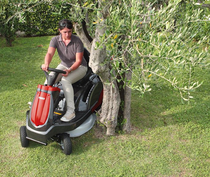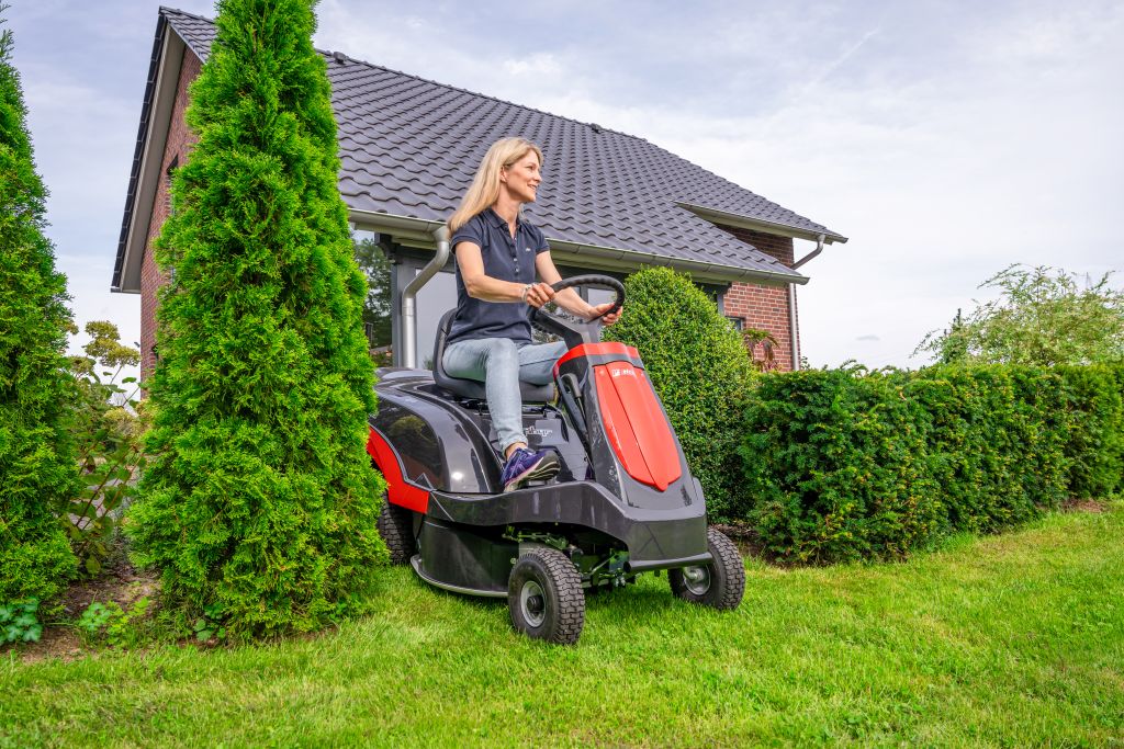 Kompakt und wendig für verwinkelte GärtenDer kleine Wendekreis und die freie Sicht nach vorne unterstützen effizientes Arbeiten in engen Passagen. Dadurch eignet sich der Mini-Reitermäher besonders für Flächen mit Bäumen, Sträuchern und Beeten. |