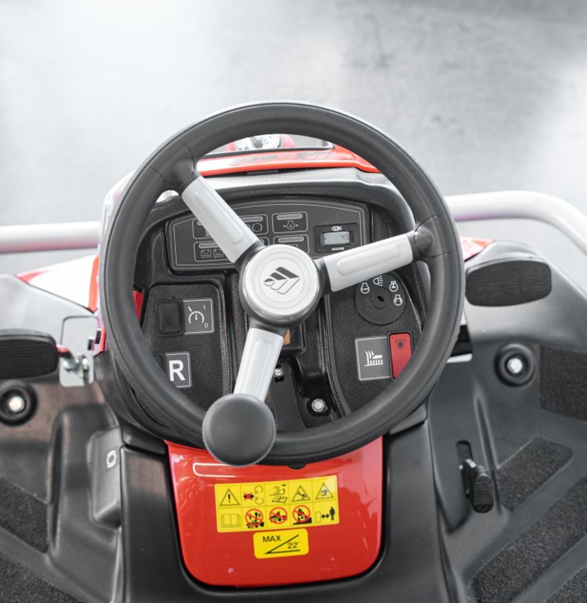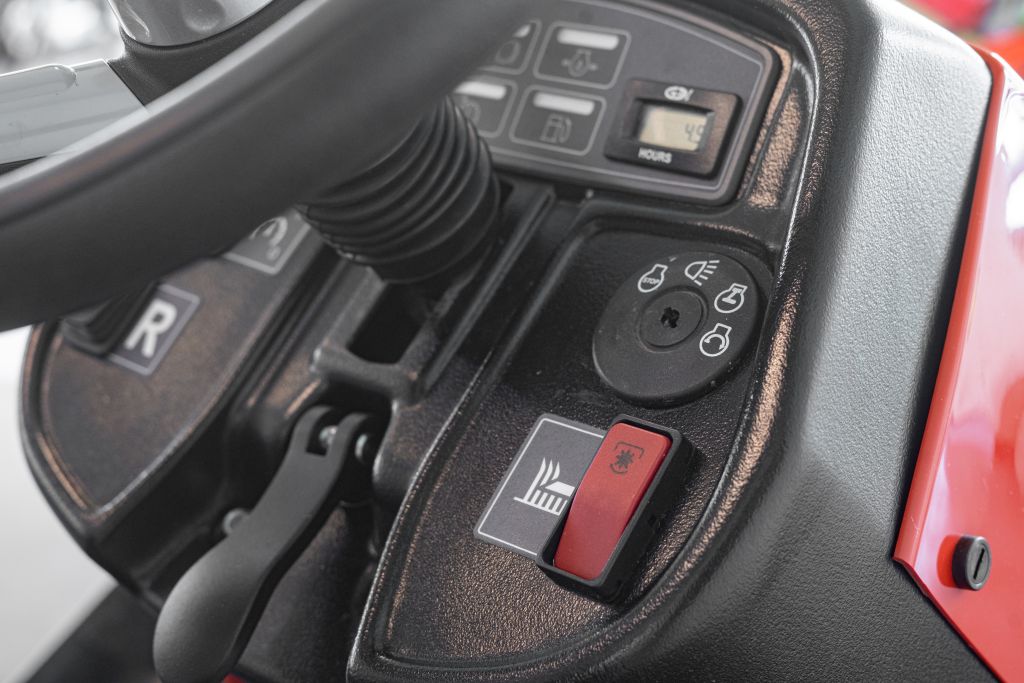 Die ergonomisch gestaltete Sitzposition, ein Komfortsitz sowie die übersichtliche Bedienung über das Armaturenbrett mit Multi-Informationsanzeige sorgen für ein angenehmes Arbeitsumfeld. Zu den Ausstattungsmerkmalen zählen ein umklappbarer ROPS-Schutzbügel, Tempomat, Anzeige zum Ladezustand der Batterie sowie eine Ölwarnlampe der Motorschmierung. LED-Beleuchtung, Stoßstange, große Bereifung mit Ackerstollenprofil und die 2-Pedaltechnik erleichtern den Einsatz im Arbeitsalltag.