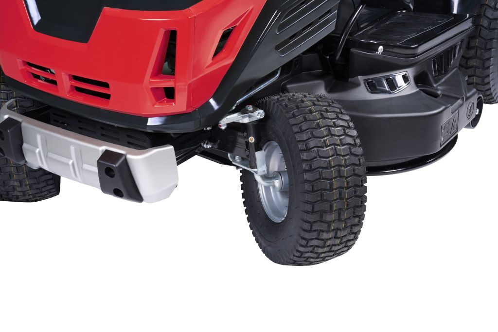 Die Metallstoßstange an der Front erhöht die Robustheit bei unbeabsichtigten Kontakten. Die Batterie ist unter dem Sitz ohne Werkzeug zugänglich; ein Batterieladegerät ist im Lieferumfang enthalten und unterstützt die Einlagerung. Ebenfalls enthalten ist eine Anhängezugvorrichtung, die den Rasentraktor für weitere Aufgaben rund um Grundstück und Garten nutzbar macht.