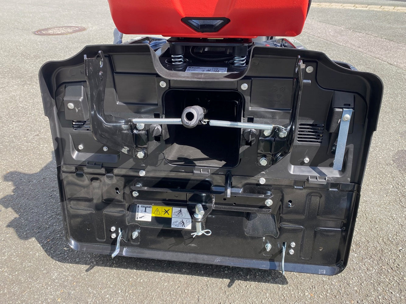 Die Metallstoßstange an der Front erhöht die Robustheit bei unbeabsichtigten Kontakten. Die Batterie ist unter dem Sitz ohne Werkzeug zugänglich; ein Batterieladegerät ist im Lieferumfang enthalten und unterstützt die Einlagerung. Ebenfalls enthalten ist eine Anhängezugvorrichtung, die den Rasentraktor für weitere Aufgaben rund um Grundstück und Garten nutzbar macht.