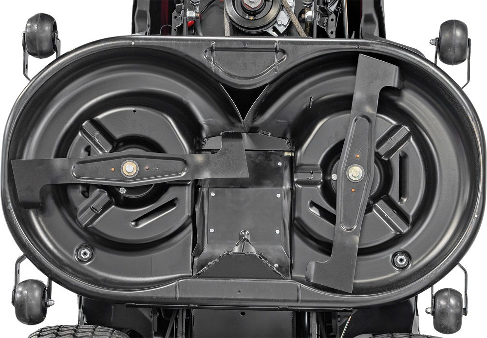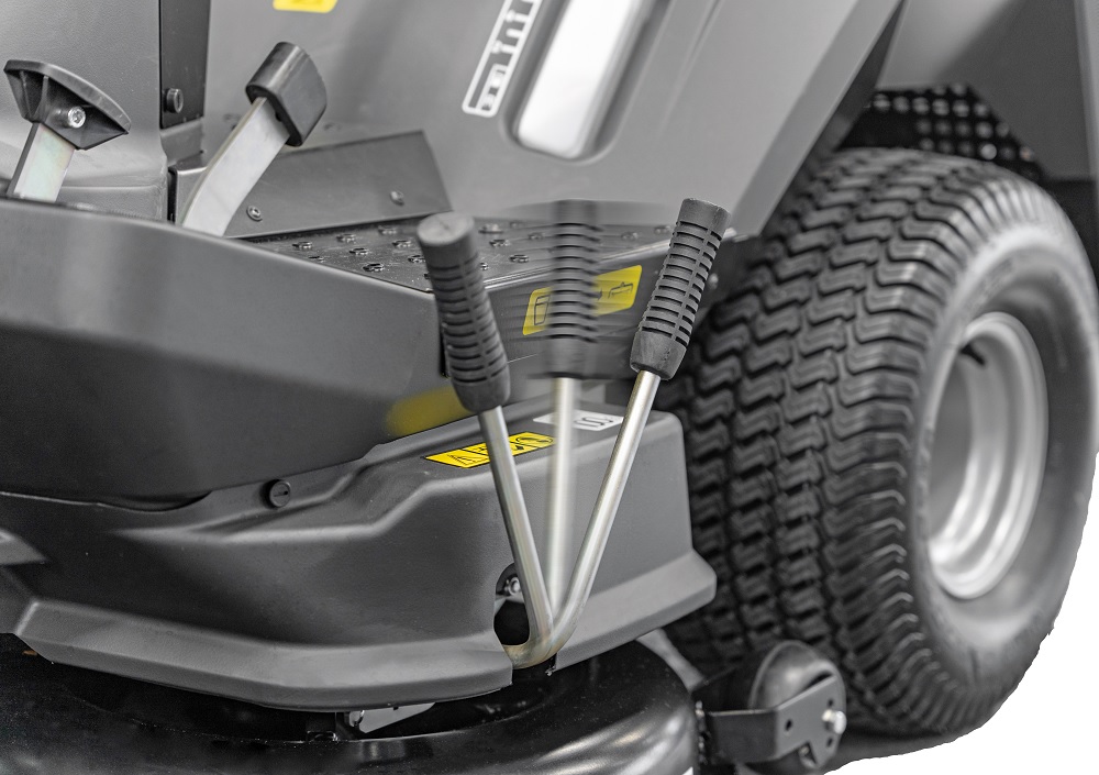 Das 102 cm breite Mähdeck arbeitet mit zwei Messern und wird über eine elektromagnetische Kupplung zugeschaltet. Die Schnitthöhe lässt sich bequem vom Fahrersitz aus im Bereich von 25–90 mm einstellen. Ein Reinigungsanschluss am Mähwerk sowie das Deckwaschsystem mit Schnellkupplung erleichtern die Reinigung der Mähdeck-Innenseite.