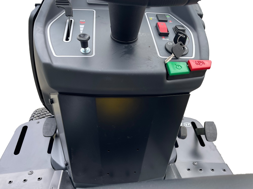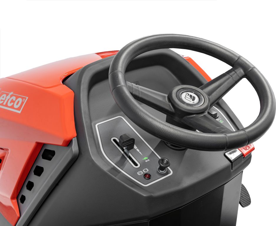 Für eine ergonomische Sitzposition wurde das Mittelpanel verengt und der Komfortsitz mit Armlehnen ausgestattet. Großzügige Beinfreiheit, angewinkeltes Lenkrad und leichtgängige Bedienelemente unterstützen komfortables Arbeiten – auch bei längeren Mähintervallen auf großen Flächen bis 10.000 m².