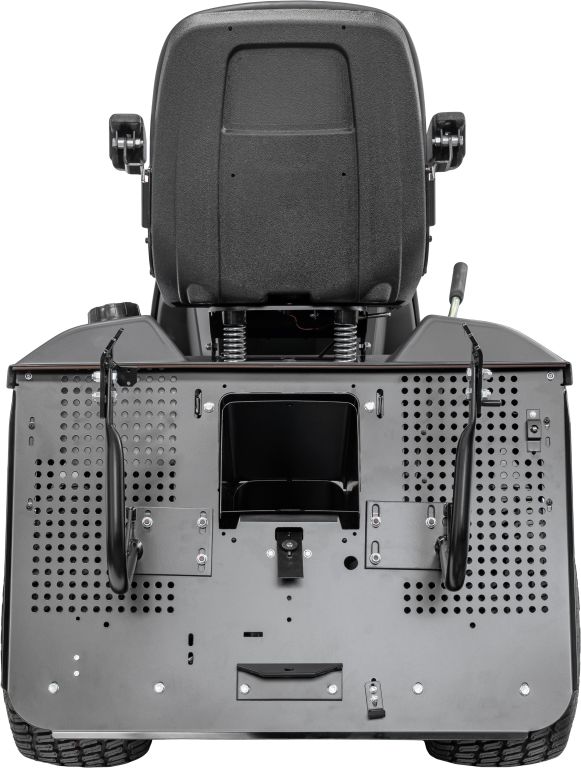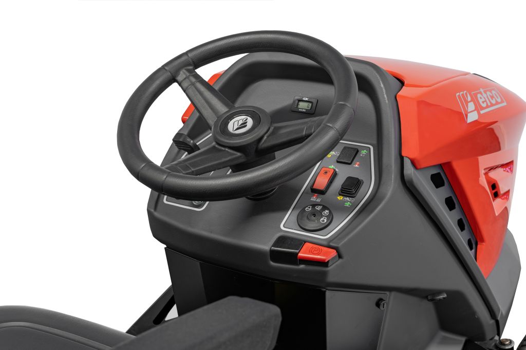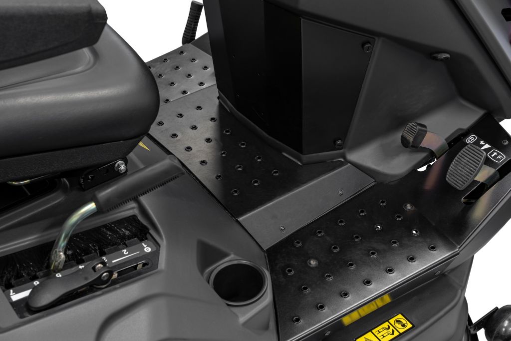 Für ergonomisches Arbeiten wurde das Mittelpanel verengt und der Komfortsitz mit Armlehnen ausgestattet. Großzügige Beinfreiheit, ein angewinkeltes Lenkrad und leicht bedienbare Elemente unterstützen komfortables Mähen auf großen Flächen in öffentlichen Anlagen oder weitläufigen Gärten bis 10.000 m².
