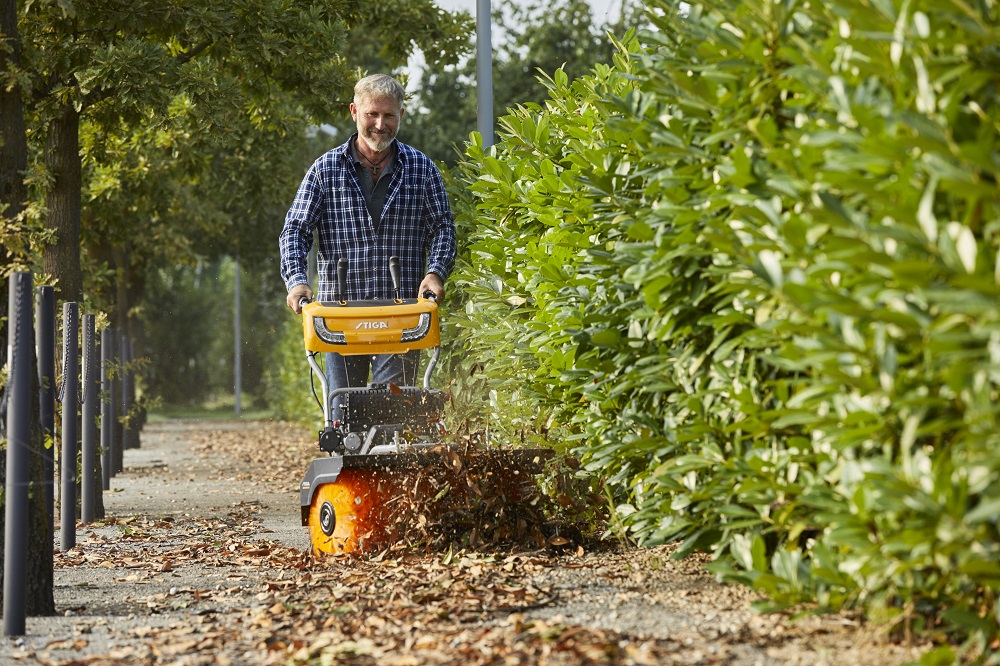 Die brandneue STIGA Benzin-Kehrmaschine SWS 800 GE ist eine vielseitige und benutzerfreundliche Stiga Kehrmaschine für den Außenbereich mit einem leistungsstarken, benzinbetriebenen 212-cm³-STIGA-Motor mit Elektrostart und LED Beleuchtung. Die Nylonbürste kann in drei verschiedene Positionen eingestellt werden (15° nach links, 0° und 15° nach rechts) und hat eine Räumbreite von 80 cm, wodurch der SWS 800 GE ideal für das Räumen von Schnee, Blättern, Grasschnitt und anderem Schmutz geeignet ist – und zwar das ganze Jahr über. Die Bürstenhöhe wird mithilfe von zwei schwenkbaren Rädern eingestellt, damit sie nach Bedarf angehoben und abgesenkt werden kann. Die zuverlässigen Snow Hog-Hinterreifen mit 14" sorgen für einen optimalen Halt. Das Einzelgriffsystem von STIGA ermöglicht einen sicheren und komfortablen Betrieb, da alle Bedientasten sofort zu erreichen sind. Die Kehrmaschine für den Außenbereich kann mit einer Vielzahl von dafür vorgesehenen Ersatz- und Zubehörteilen kombiniert werden, beispielsweise Schneeschild und Frontsammelbehältern, wodurch die Maschine äußerst vielseitig ist.