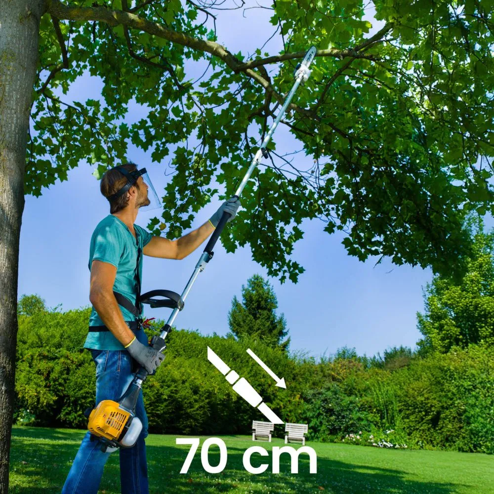 Alle Aufsätze können zusätzlich mit der enthaltenen 70 cm Schaftverlängerung genutzt werden, um mehr Reichweite zu erzielen. Der Einzelgurt verbessert die Gewichtsverteilung und unterstützt komfortables Arbeiten. Mit Softgrip, Vibrationskontrollsystem (VCS) und griffnahen Bedienelementen ist das Multitool auf sichere, praktische Handhabung ausgelegt.