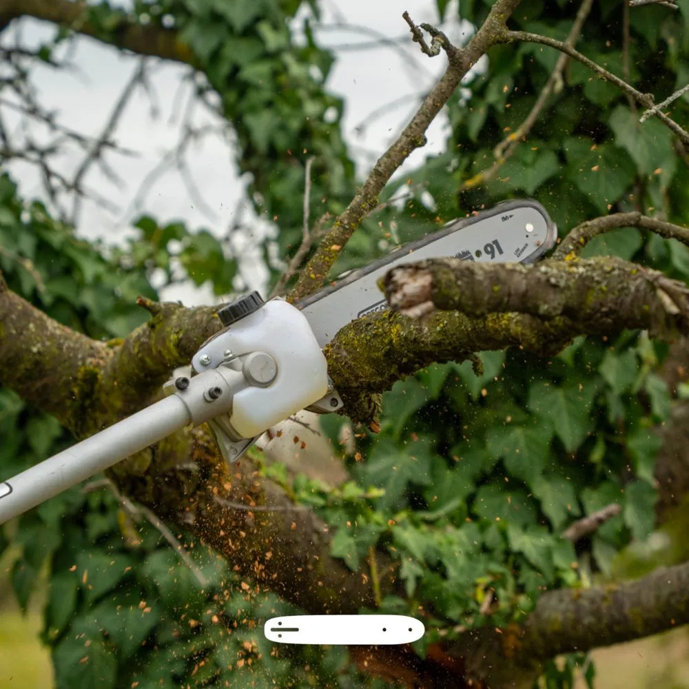 Hochentaster für Äste und RückschnittMit 25 cm Schwert (10"), automatischer Ölpumpe und frontseitiger Schraub-Spannung ist der Hochentasteraufsatz auf zuverlässige Schnittarbeiten ausgelegt. Ideal für kurze Rückschnitte an Ästen. |