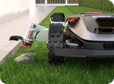 Auch enge Winkel und schwer zugängliche Bereiche lassen sich mit dem Seitentrimmer zuverlässig nacharbeiten. Damit ergänzt das Modul den Mähroboter ideal, wenn ein bündiges Mähen entlang von Begrenzungen gewünscht ist.