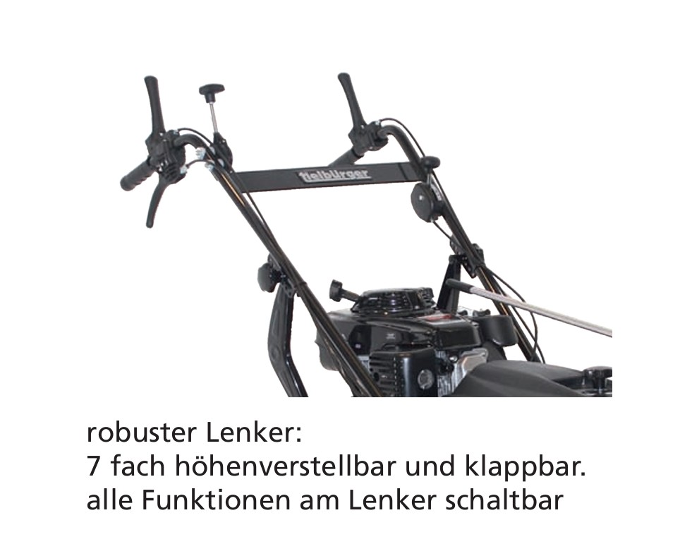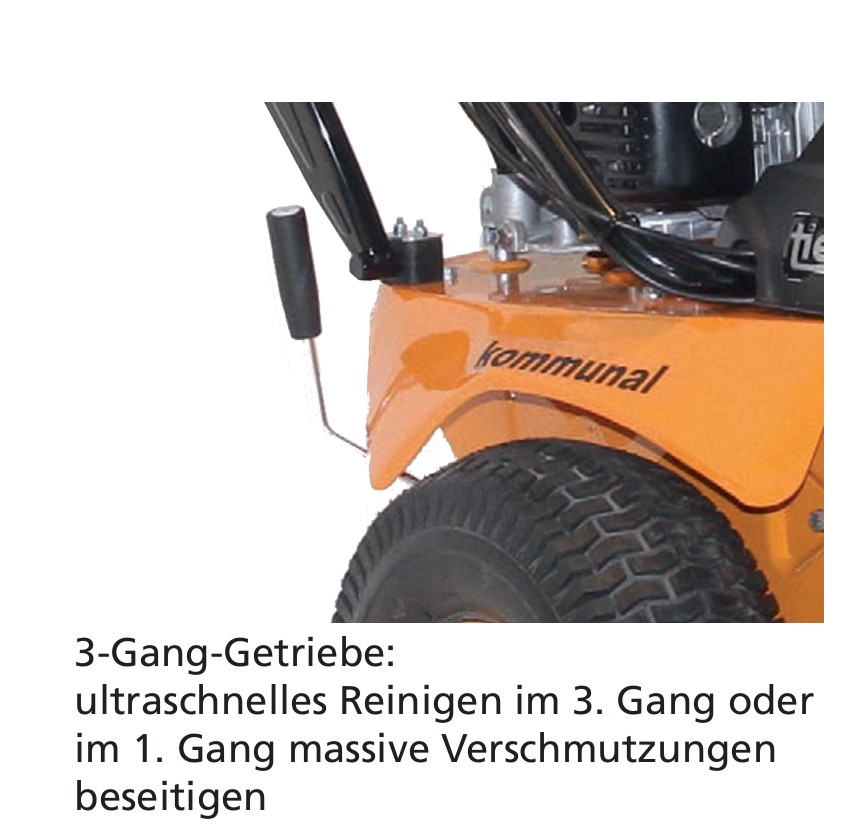 Das 3-Gang-Getriebe mit 3 Vorwärtsgängen und 1 Rückwärtsgang ermöglicht sowohl zügiges Reinigen auf großen Flächen als auch kraftvolles Arbeiten bei starker Verschmutzung. Der robuste Lenker ist 7-fach höhenverstellbar und klappbar; alle Funktionen sind bequem am Lenker schaltbar und damit schnell erreichbar.