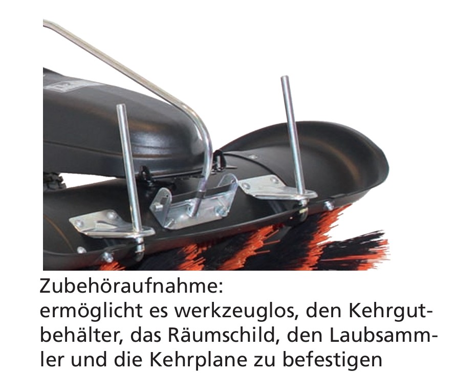 Werkzeuglose Zubehöraufnahme – ganzjährig flexibelMit der werkzeuglosen Zubehöraufnahme montieren Sie optionales Zubehör schnell und einfach. Kehrgutbehälter, Laubsammler, Räumschild oder Steinschlagschutzplane machen die Kehrmaschine zum echten Ganzjahresgerät. |