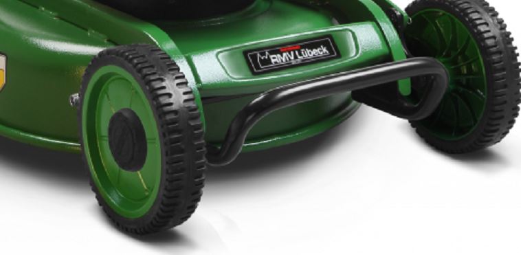 Das strapazierfähige Stahlgehäuse ist auf dauerhafte Widerstandsfähigkeit ausgelegt. Details wie Frontanfahrschutz, durchgehende Achsen sowie Abstreifer an Vorder- und Hinterrädern unterstützen den Einsatz unter anspruchsvollen Bedingungen und reduzieren Anhaftungen bei schwierigen Mähsituationen.